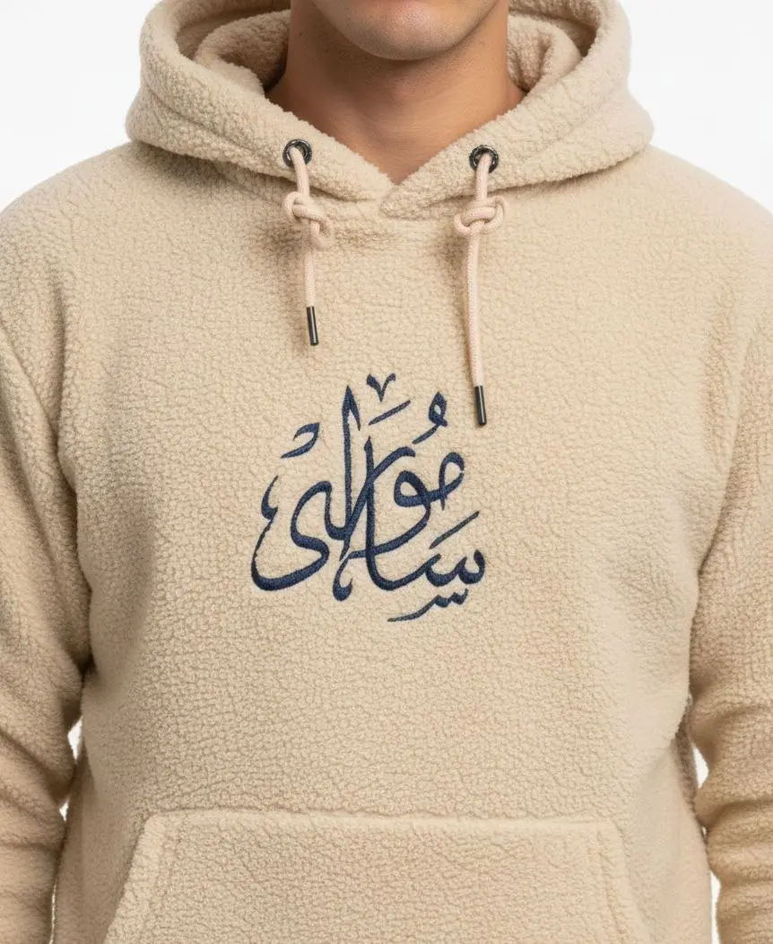 التطريز الأمامي: يتوسط الصدر تصميم بالخط العربي (غالباً تطريز بارز) باللون الأبيض الكريمي أو "الأوف وايت"، مما يعطيه لمسة تراثية عصرية.