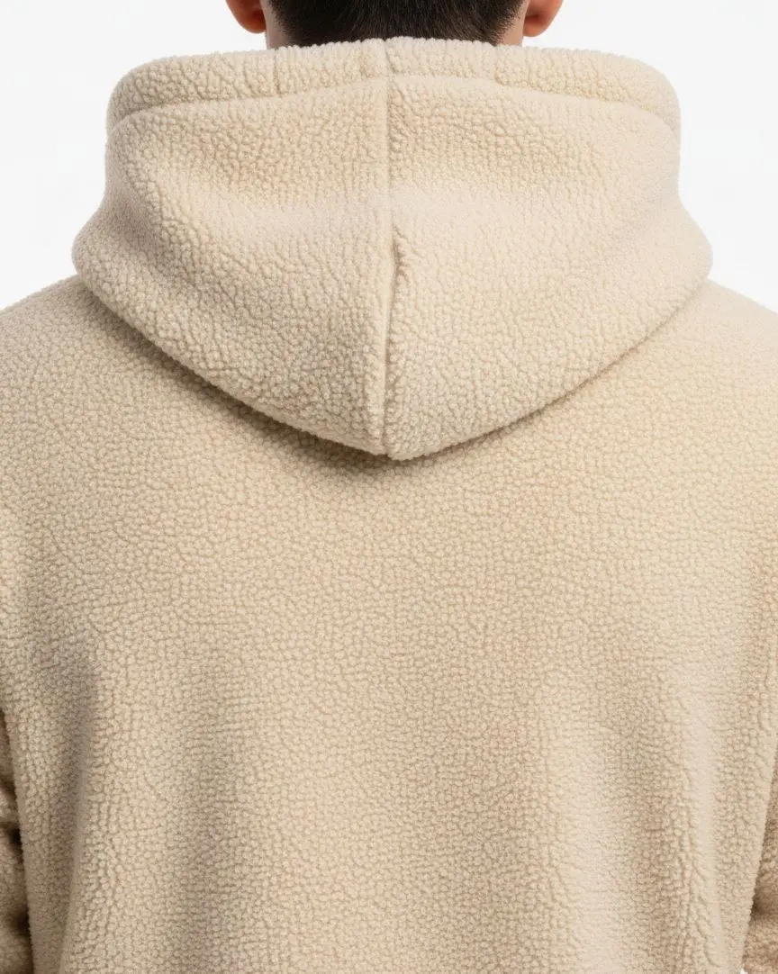 الغطاء (Hood): مزود بغطاء رأس متصل بنفس خامة "البورج"، مع حبال تضييق (Drawstrings) باللون الرمادي المتناسق.